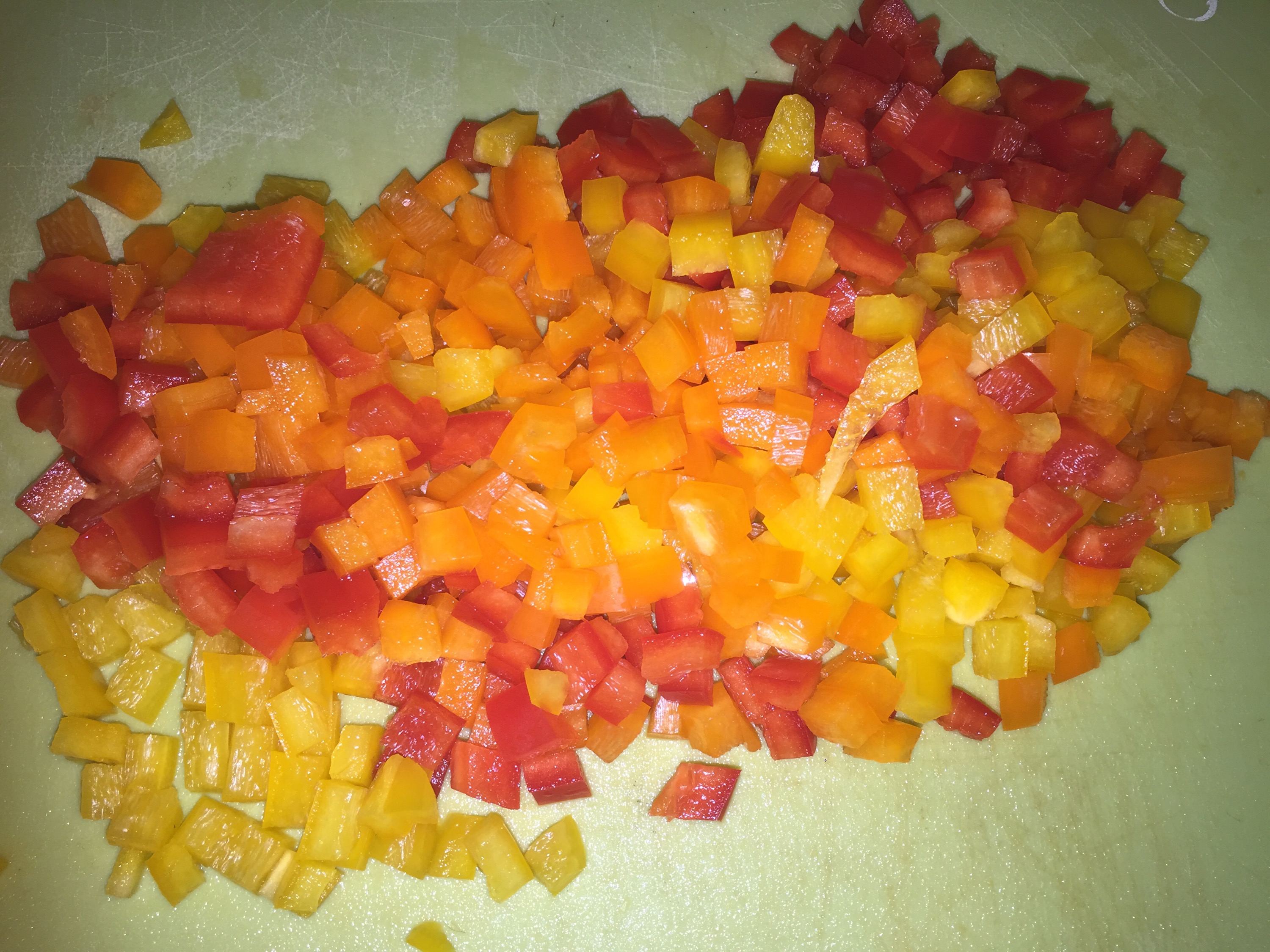 The recipe calls for one green and one red bell pepper. I an not a green bell pepper fan. And I already had red, orange, and yellow peppers in the fridge. Done.