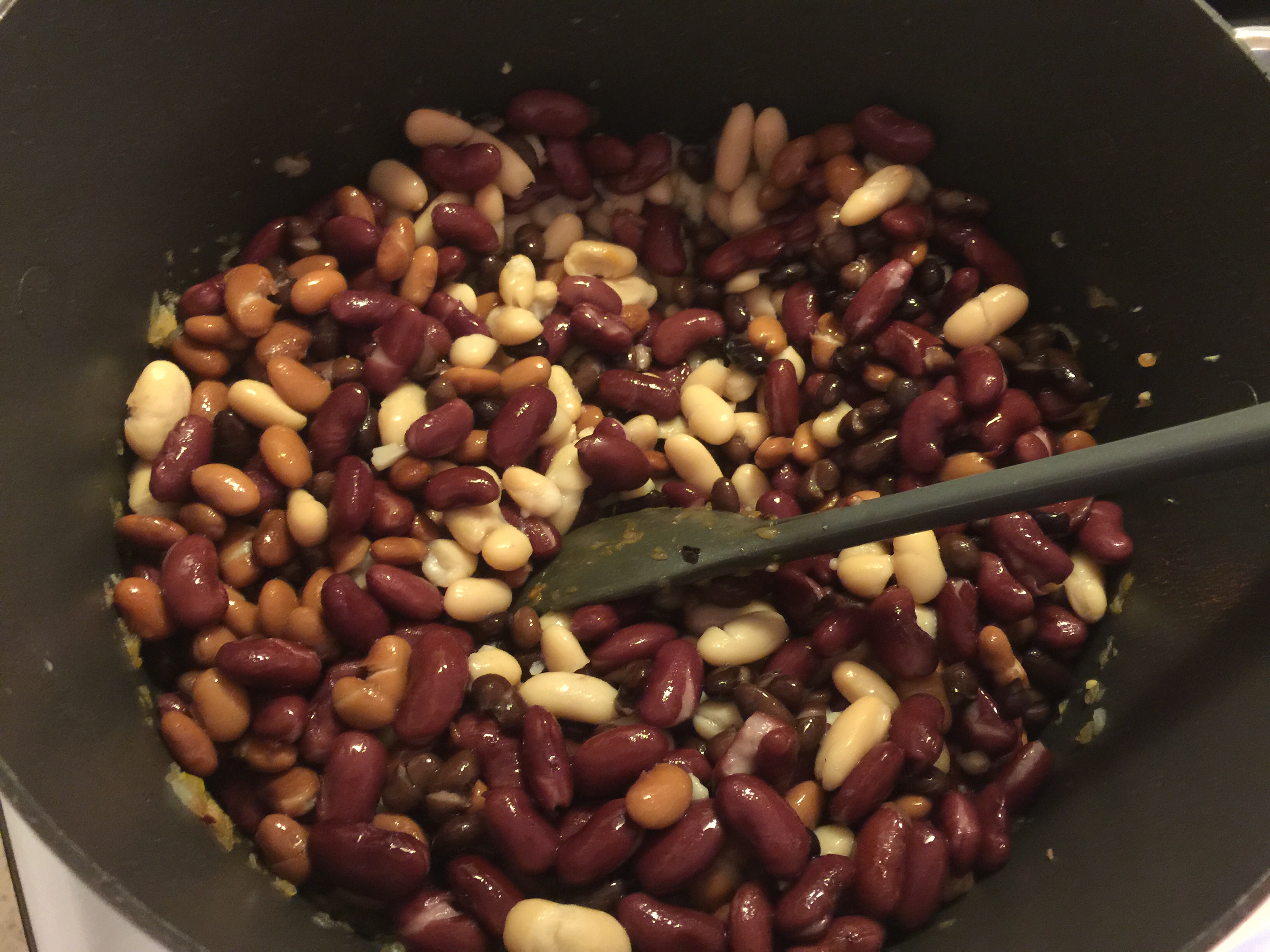 I used all the kinds of beans I had in the pantry; kidney, pinto, black and canellini (not just the kidney or pinto the recipe called for) and I really like how that turned out! I also love any reason to expose little man to different types of food. He’s a great eater and I’d like to keep it that way.